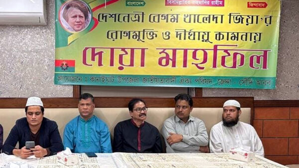 অনলাইন ডেস্ক :: সাবেক প্রধানমন্ত্রী ও বিএনপি চেয়ারপার্সন বেগম খালেদা জিয়ার রোগ মুক্তি ও সুস্থতা কামনায় কানাইঘাট উপজেলা জাতীয়তাবাদী ঐক্য পরিষদের উদ্যোগে সৌদিআরবের জেদ্দায় গত বৃহস্পতিবার এক দোয়া মাহফিল অনুষ্ঠিত
